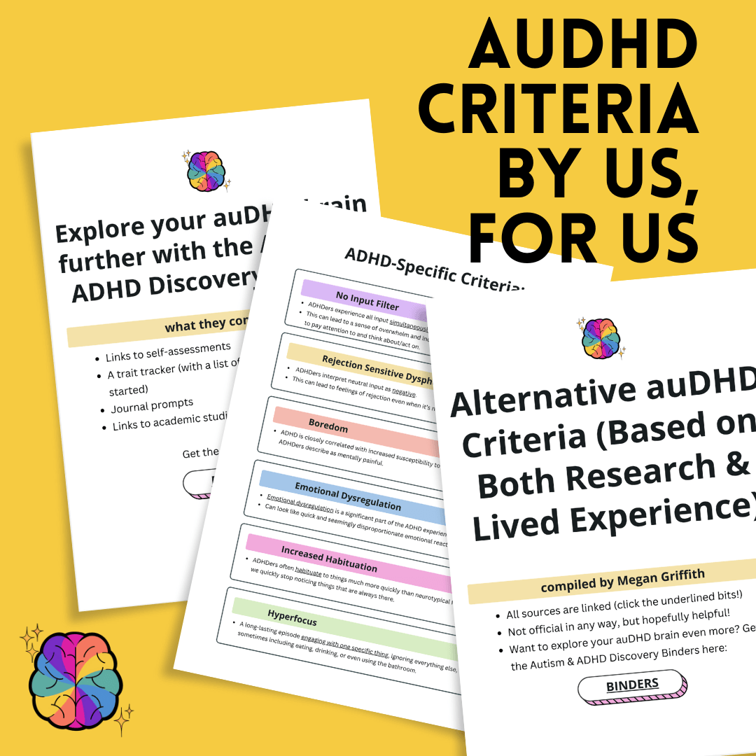 That's exactly what I've compiled here. Through studying academic and clinical research, and talking to auDHDers about their lived experience (and my own), I've pulled together some alternative criteria for ADHD, autism, and auDHD.